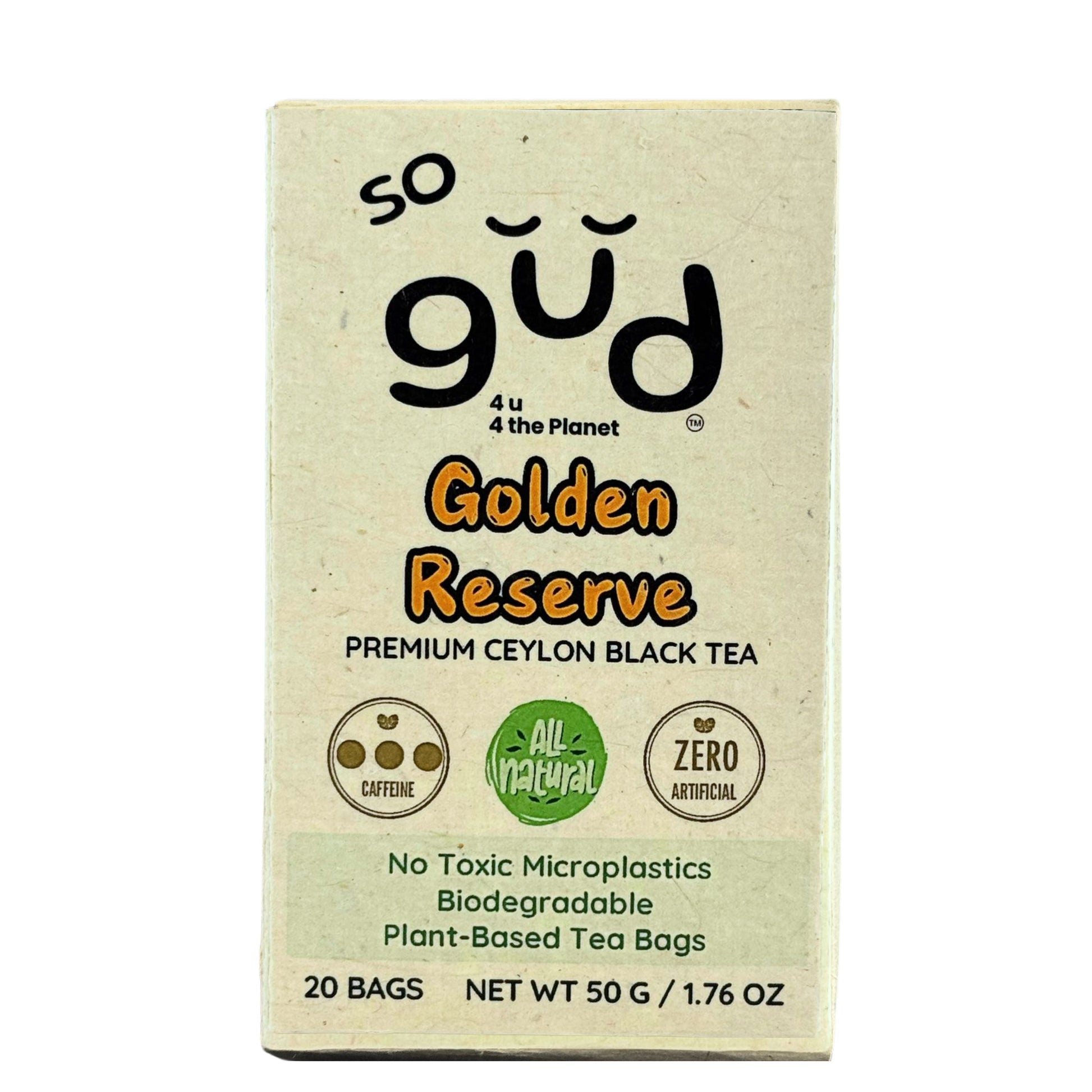 Crafted with care and packed in 100% compostable, plastic-free pyramid tea bags, this exquisite blend combines quality, sustainability, and tradition in every sip. Elevate your tea experience with Golden Reserve, a brew that’s always so gud™ for you and the planet.