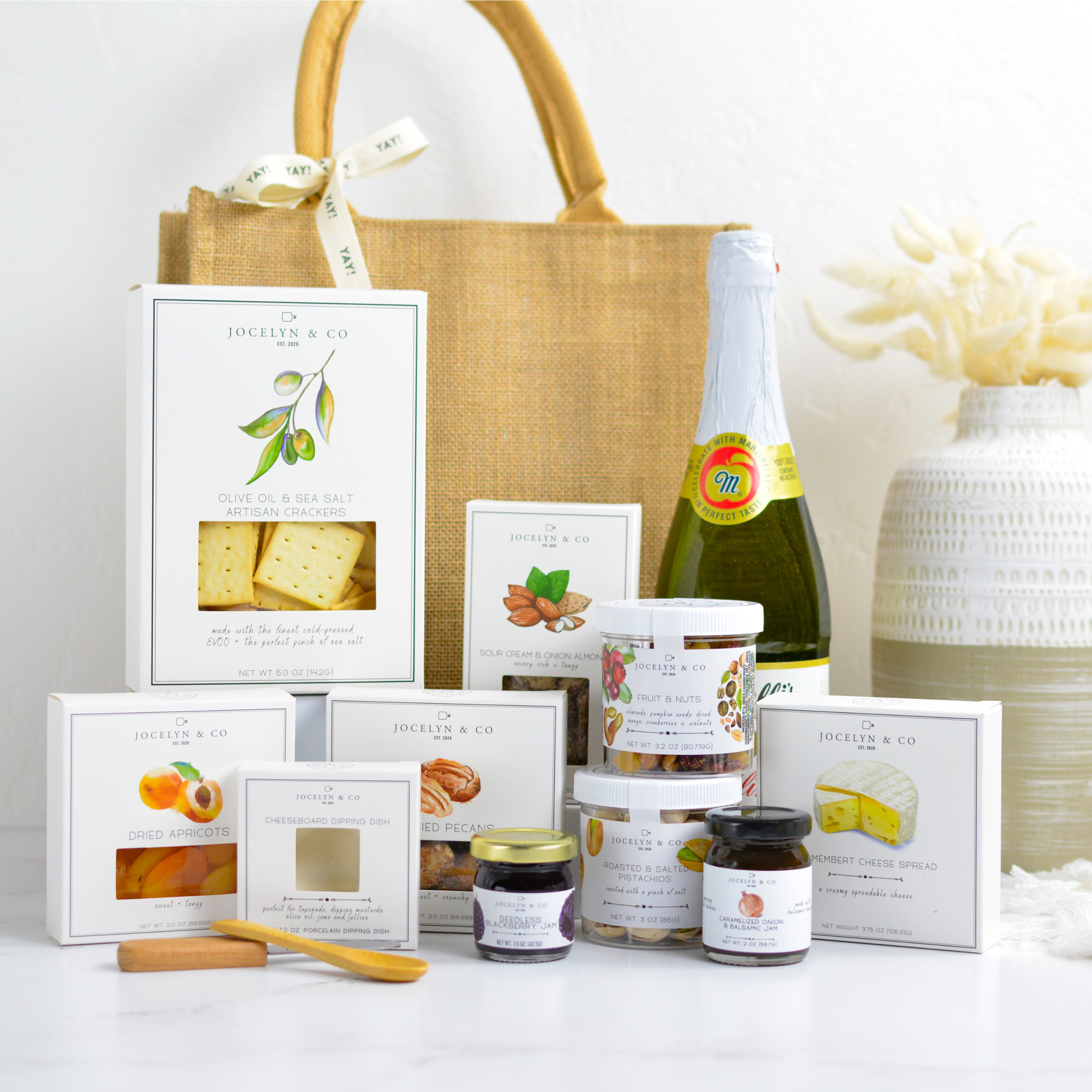 A joyful, generously curated grazing gift designed to celebrate life’s happy moments. This celebratory assortment features Jocelyn & Co. favorites including creamy Camembert cheese spread, olive oil and sea salt artisan crackers, roasted pistachios, sour cream and onion almonds, dried apricots, honey, fruit and nut mix, and sweet preserves. Paired with a ceramic cheeseboard dipping dish, wooden spreaders, it offers everything needed for effortless celebrating and sharing.